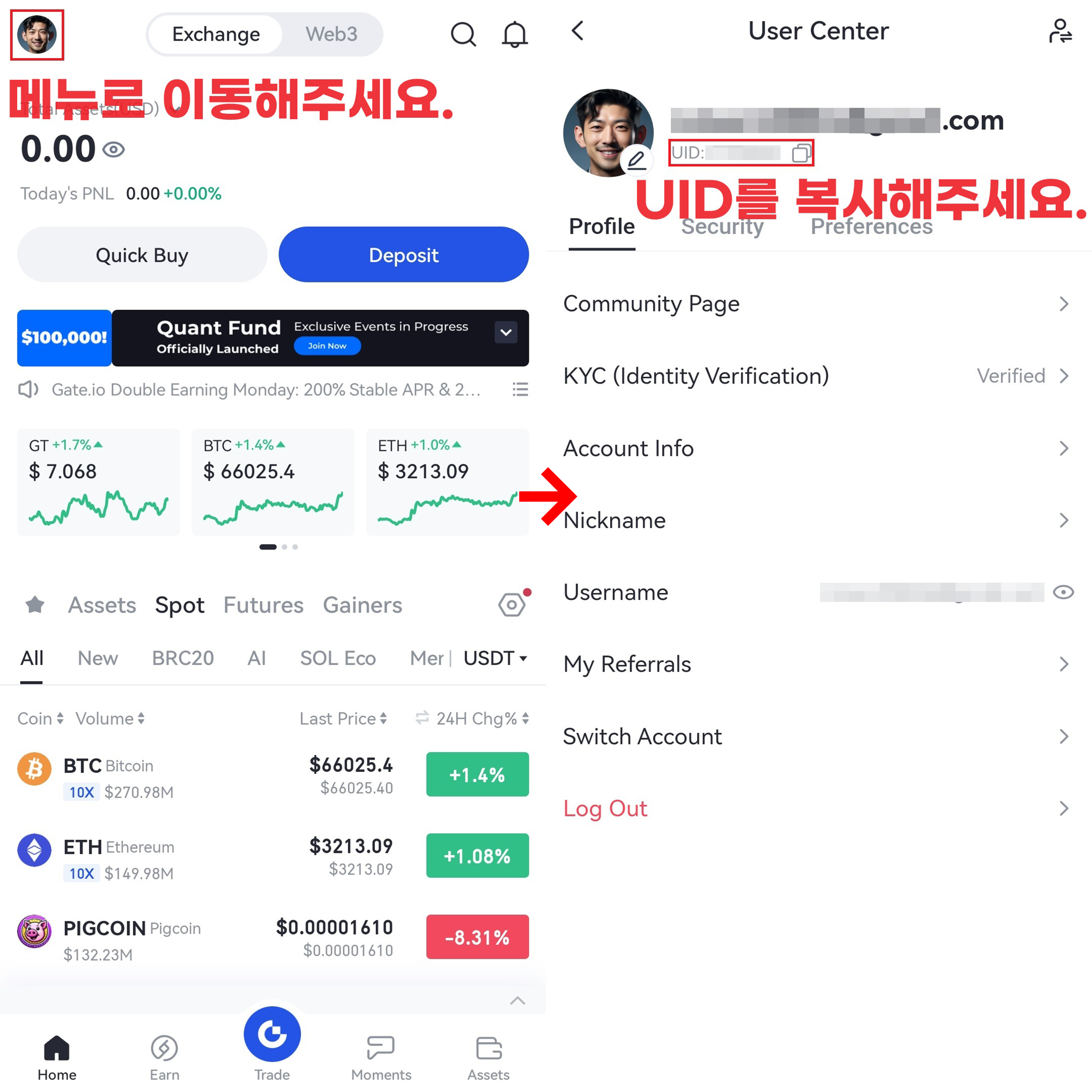 이후 Gate.io의 '새로운 계정'의 UID 값을 복사해서