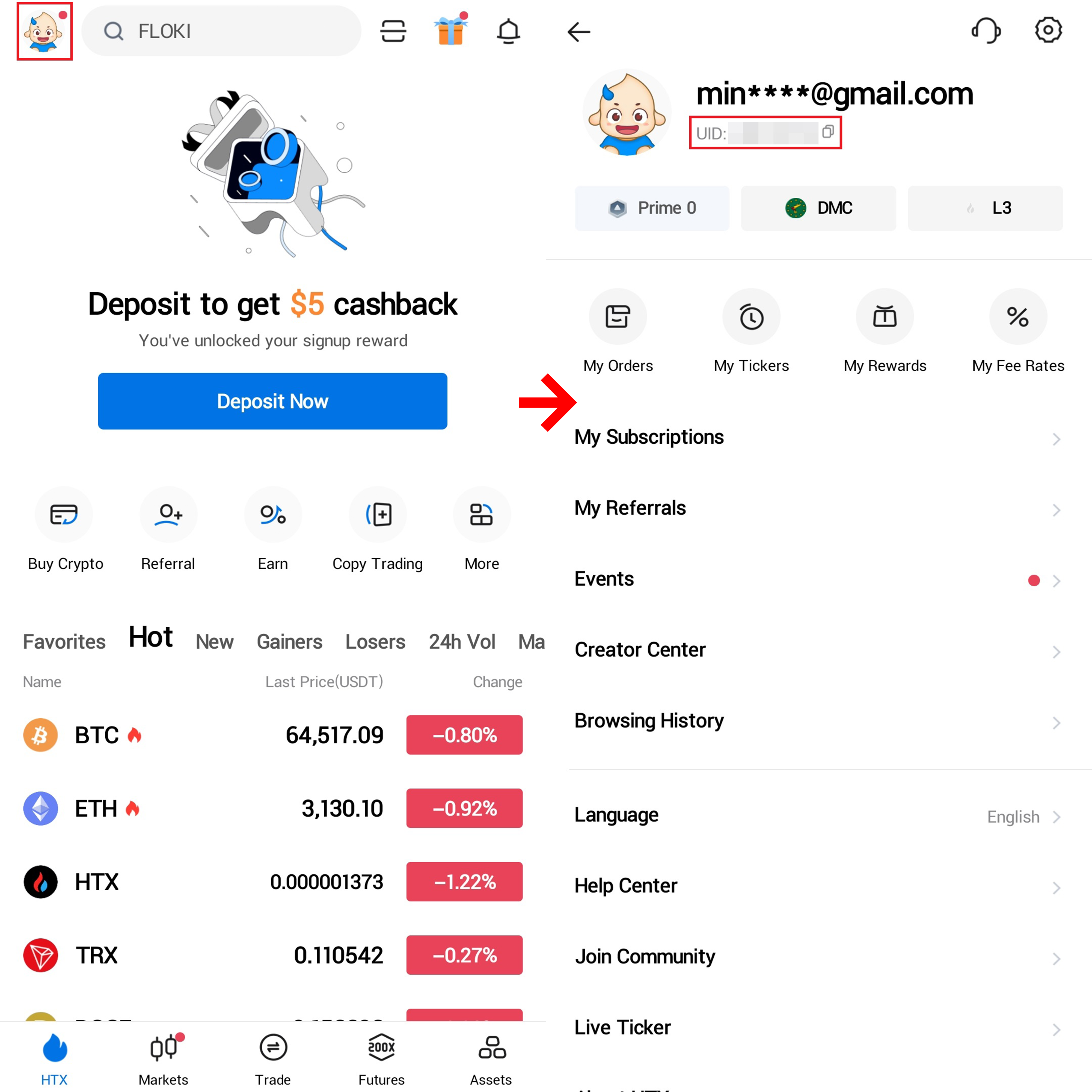 이후 HTX의 '새로운 계정'의 UID 값을 복사해서